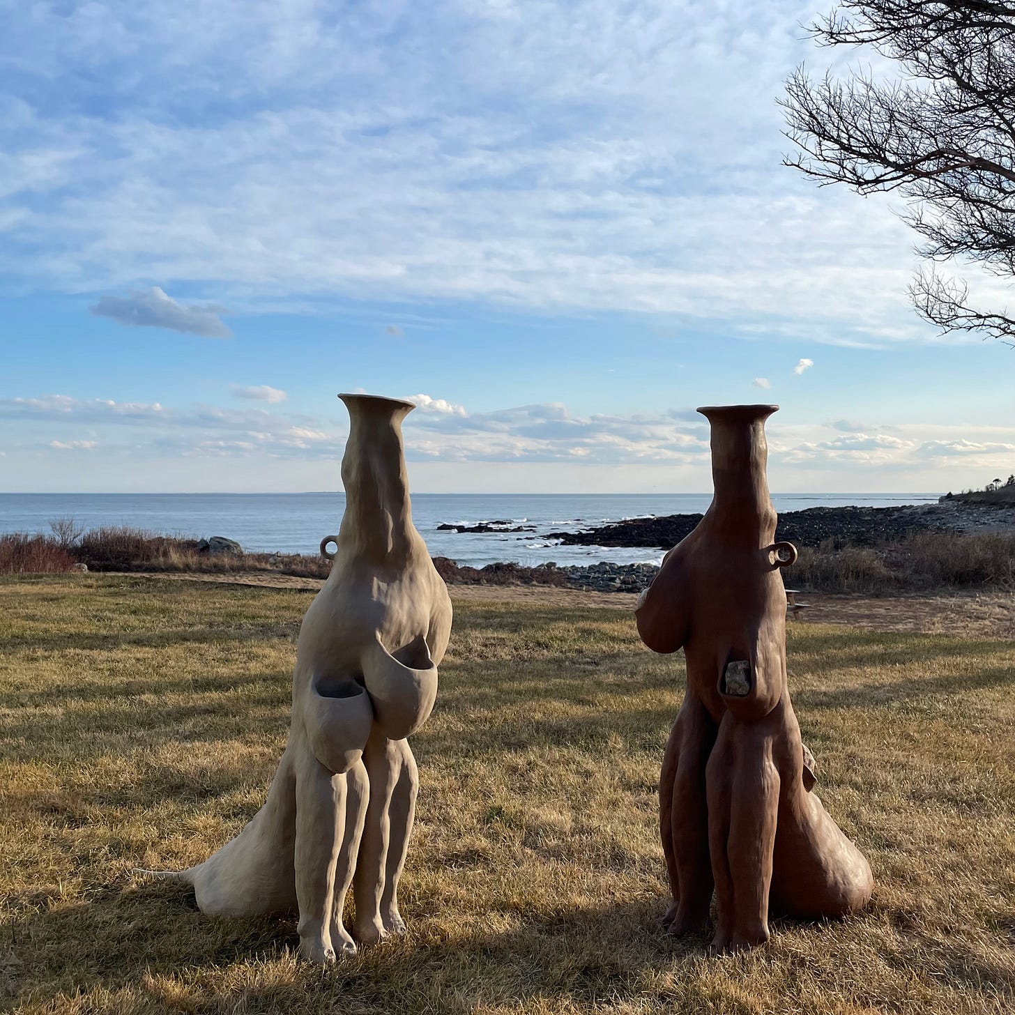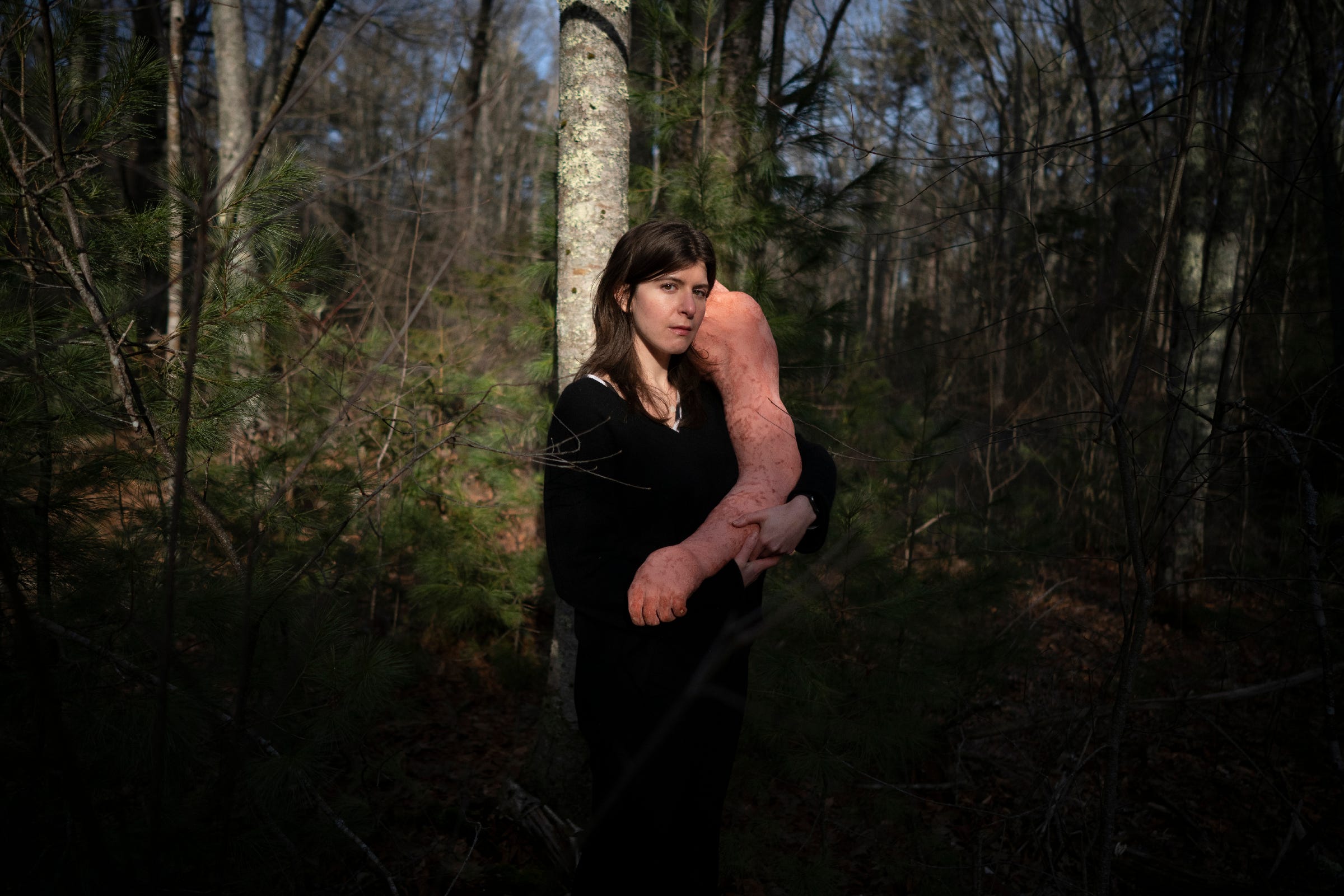 Once I got back to New York, I realized all of the work in my show can be grouped in pairs, save for one sculpture. It finds its pair in the viewer, or for now in me. I’ll end this first edition with this photograph my fellow resident Jake Price took of me and this sculpture in the Maine forest. Thank you for reading & talk soon.