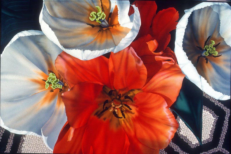 As I learned more about Beverly’s practice, it was exciting to see that she too was fascinated by these often unruly blooms. I love how dramatic and decidedly unprecious she portrays the flowers in her paintings.