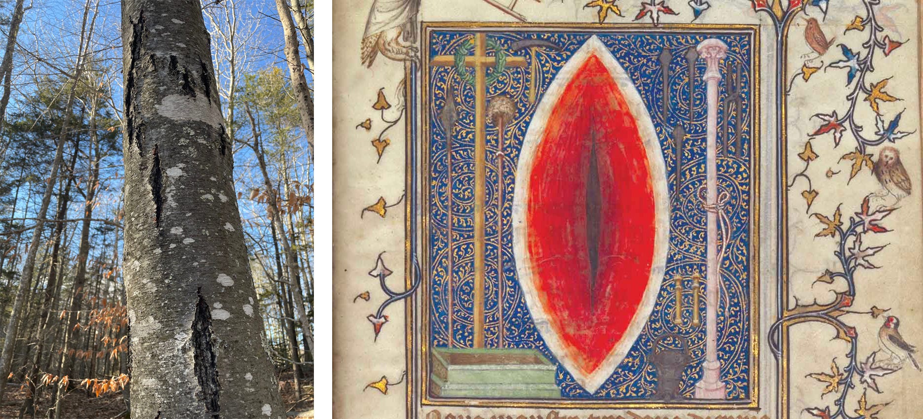With the idea of signatures floating through my mind, I found myself making lots of visual connections. The gashes in the trees immediately reminded me of this particularly yonic rendition of Christ’s side wound from The Prayer Book of Bonne of Luxembourg.